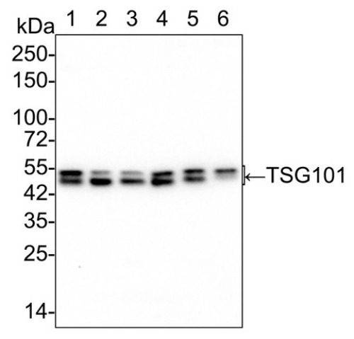 Western blot-analyse af TSG101 på forskellige lysater med TSG101-antistof.