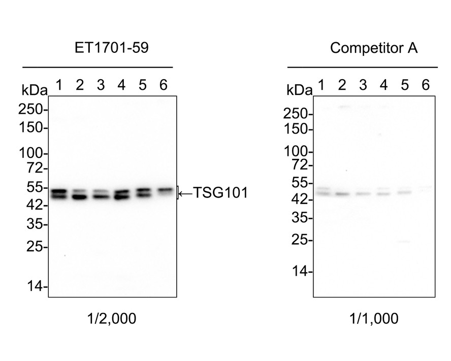 Western blot-analyse af TSG101 på forskellige lysater med TSG101-antistof.