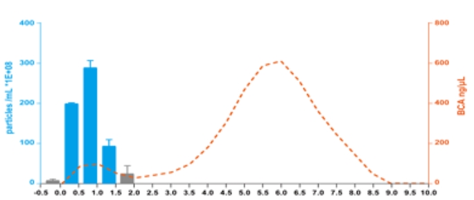 Nota: il diagramma della colonna blu rappresenta le frazioni di raccolta raccomandate, divise in frazioni di esosoma e tre frazioni da 0,5 ml.